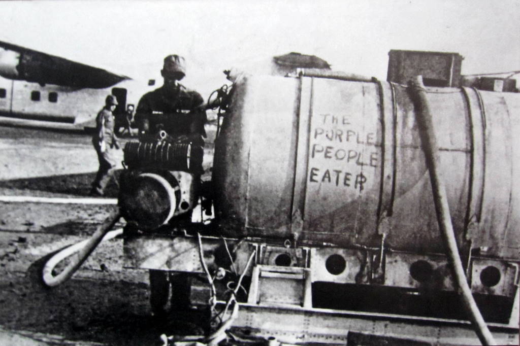 [ I have recently been in Vietnam and in the war museum there is a picture of a US soldier next to a bomb with "purple people eater" written on it. agent orange was a chemical sprayed on the forests to kill the leaves on the trees and agent orange was almost exactly the same as "agent purple..." the chemical caused numerous health problems in the Vietnamese and still does today. ]
