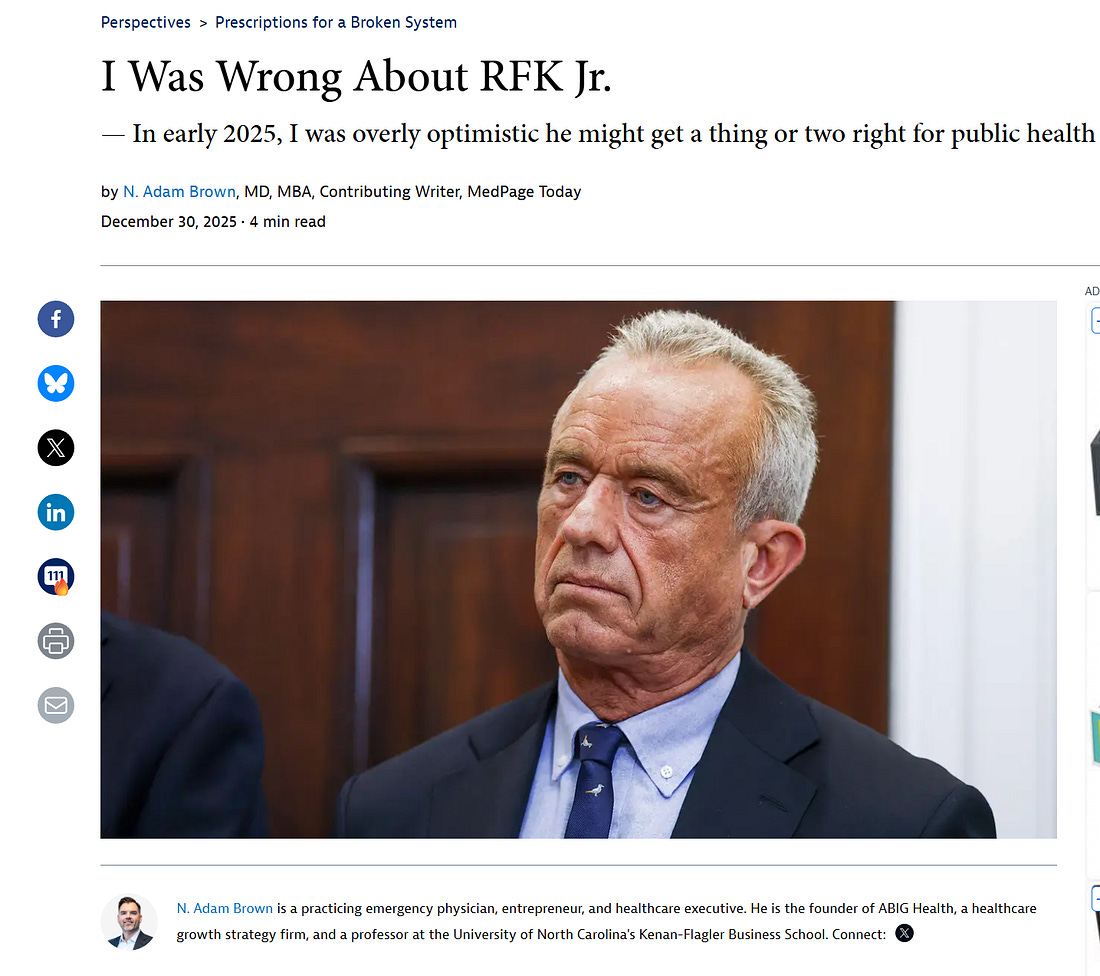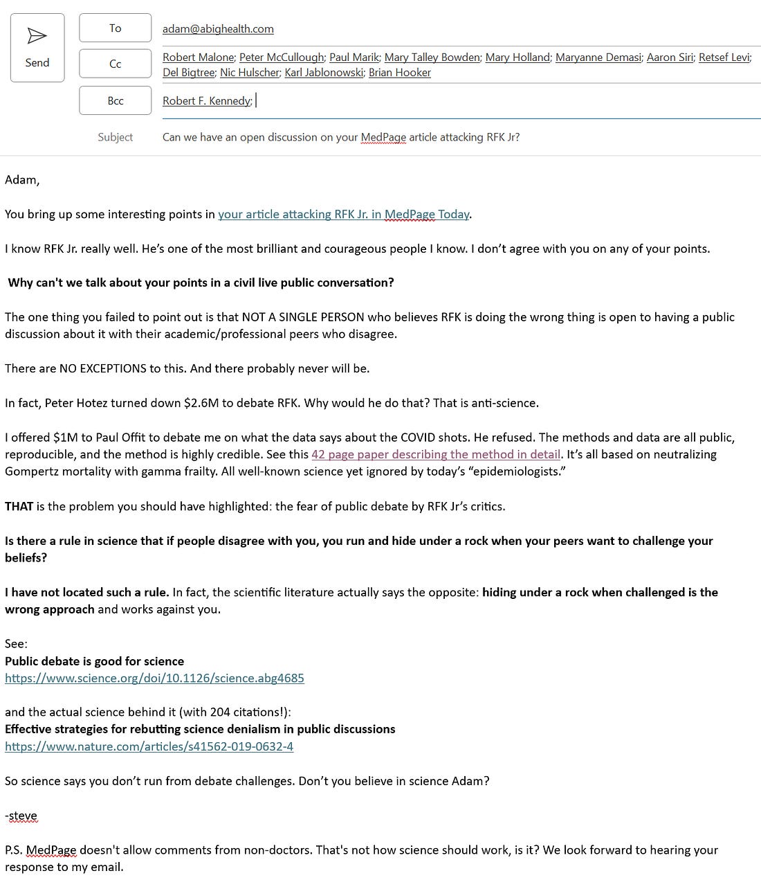 Here's the email I just sent to Dr. Brown about his article which misses the key point: none of the people who think RFK Jr. is doing a "bad job" will debate him or their peers about it.